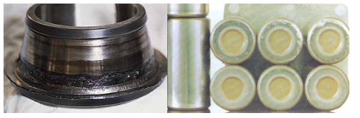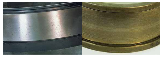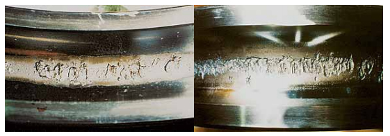 對稱位置剝落表現(xiàn)在內(nèi)圈為周圍環(huán)帶剝落,而外圈呈周向?qū)ΨQ位置剝落(即橢圓的短 軸方向),其產(chǎn)生原因主要是因為軸承箱孔橢圓過大。當(dāng)軸承壓入橢圓偏大的軸承箱孔中 時,使軸承外圈產(chǎn)生橢圓,在短軸方向的游隙明顯減少甚至負(fù)游隙。軸承在載荷的作用 下,內(nèi)圈旋轉(zhuǎn)產(chǎn)生周向剝落痕跡,外圈只在短軸方向的對稱位置產(chǎn)生剝落痕跡,這是該 軸承早期試銷的主要原因。采取的對策是提高軸承箱孔加工精度。